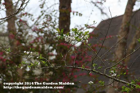 The image above is likely a crabapple. Note the pale pink blossoms, indicative of the Malus genus. Below is what looks like a wild apple. Its a rather old, shaded tree, but the flowers were all white and very beautiful in the afternoon sun.