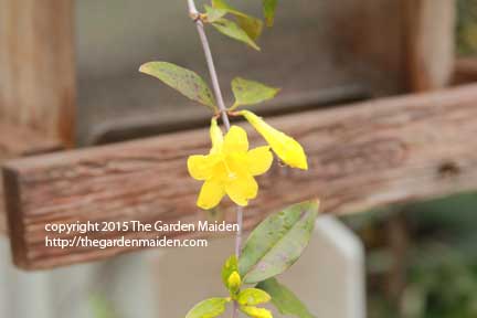The first couple of yellow blossoms of Gelsemium sempervirens have opened on my patio.