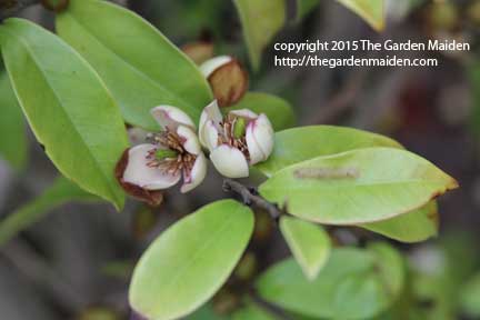 The wisteria has a very sweet perfume, that lightly scents the air. But if it is spring perfume you are seeking, then I am excited to share my new acquisition:  a banana shrub (Michelia figo). This member of the magnolia family easily perfumes a fifteen by fifteen foot area near my patio. It smells so delicious I want to eat it, or at least whip up a batch of banana daiquiris. It looked really awful at the nursery, but it was the only one. I hope to make it happy and fertilizer it gently all year with fish emulsion to bring it back to full vigor.