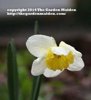 I have several varieties of Narcissus planted in a bed around a river birch. The bed was already there when I moved into the house.  I cannot remember what the species or variety is and I would rather not guess, than to be incorrect.  I labeled them at planting, and, gulp, the names faded from the plant labels. This winter I “found” some Narcissus growing near the shaded fence in my back yard and I plan to move them to a sunnier location so they will flower next year. (Don’t you love “finding” plants someone else planted at your house previously?)